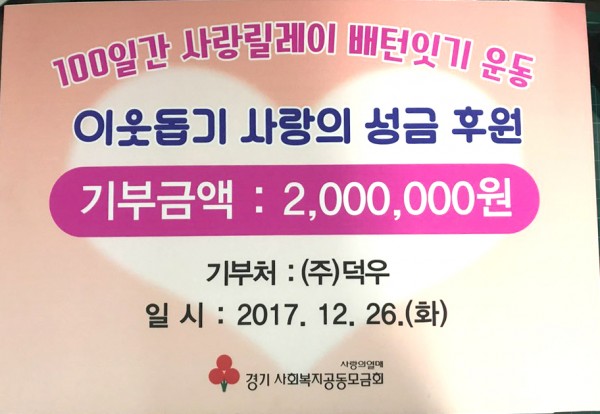 (주) 덕우 '100일간 사랑릴레이 배텃잇기 이웃돕기 사랑' 후원금 전달